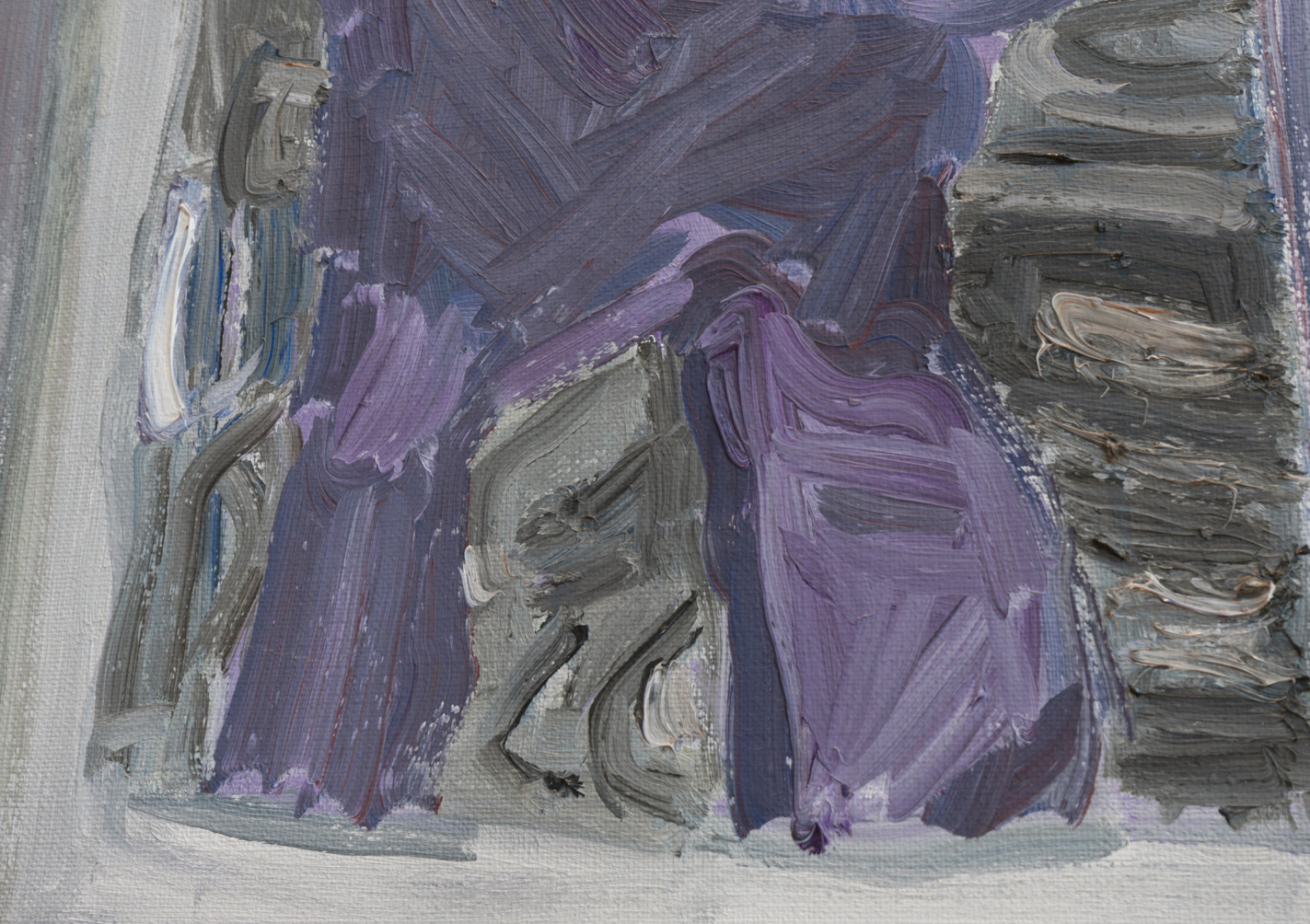 Zachytáva slávnu 72. ulicu ako scénu cez rozbité okno. Na prvý dojem pôsobí ako fotografia, no v skutočnosti je to skôr pocit z mesta. New York je rýchly, preto tu nie sú jasné tváre, len útržky a záblesky: žltý fľak taxíka, kúsok vlajky, rozviaty kabát človeka v pohybe. V obraze sa mieša sneh, tma, asfalt aj dym. Mesto nie je úplne zreteľné, skôr sa len naznačuje, akoby sa naraz rozpadalo aj skladalo dokopy. Výsledkom je zachytený pulz veľkomesta v dvoch častiach. Foto credit Leontína Berková.